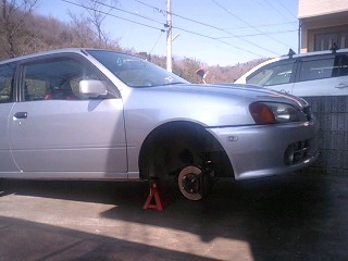 仕方なく私の実家に運んで家でジャッキアップしてウマで固定。
