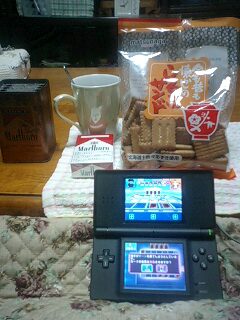 写真はしるこサンドとDSと、いつも使っているコーヒーのコップ、